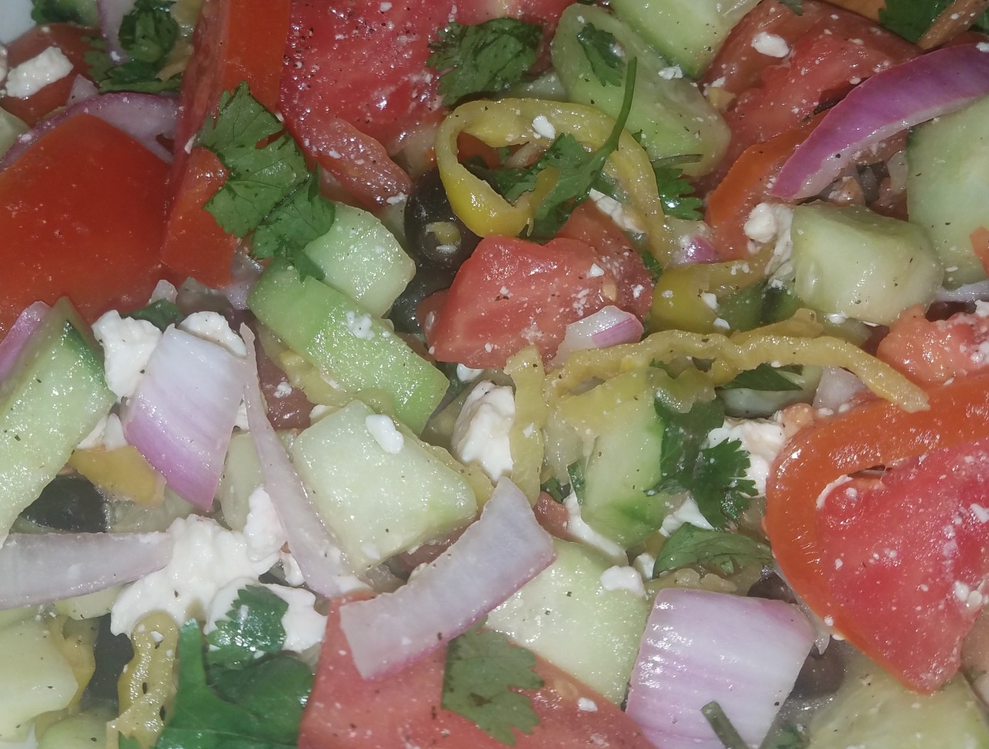 What’s in it? Cilantro, peperoncini, tomato’s, cucumbers, red onions, black olives and feta cheese.