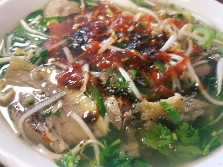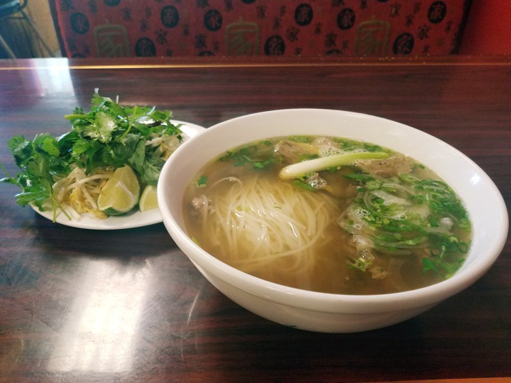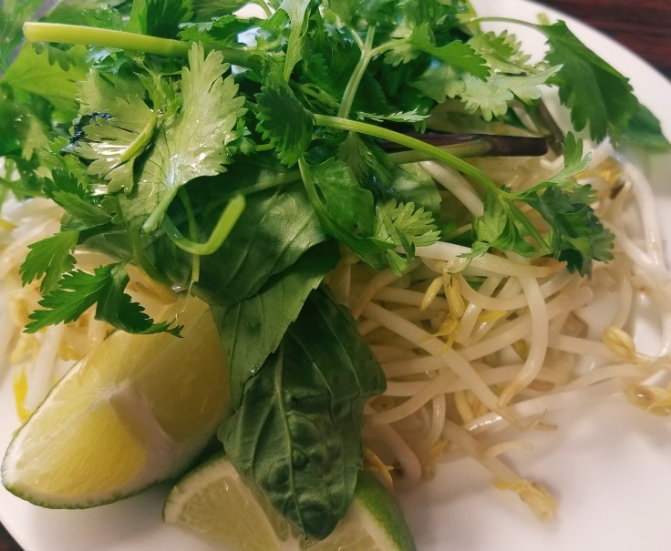 Pho is a very satisfying and simple Vietnamese noodle soup. I go with the beef pho due to my dietary restrictions. All that means is that this is a beef broth base. When making pho, Anise is bundled with other herbs/spices in a spice bag and cooked for hours. Anise is the mystery flavor that immediately sticks out when tasting pho. Various thin, tender cuts of beef are added in along with noodles when served. You’re presented sides and additional herbs to add in based on your liking. Pictured here is thai basil, bean sprouts, cilantro, jalapenos and limes to squeeze in.
