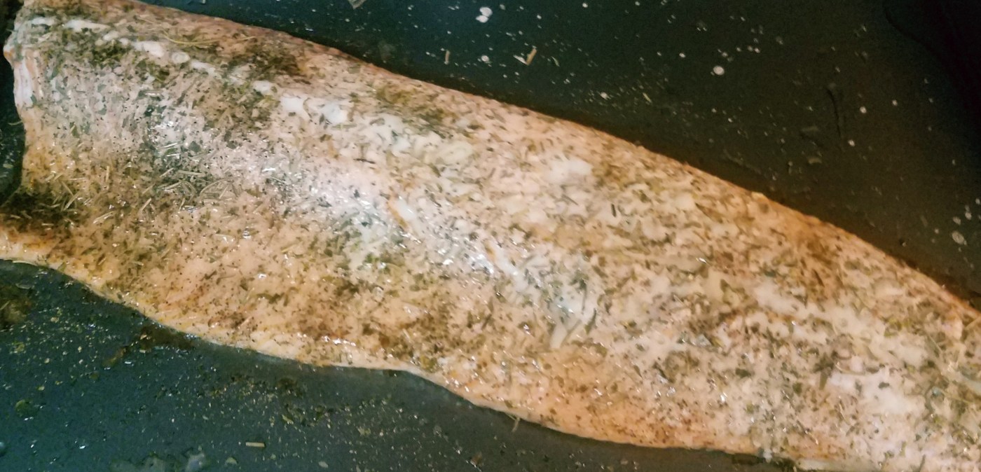 Or have a nice healthy meal and look expert if somebody happens to drop by. 😂😂 I know it sounds terrible but really it’s not LOL. I start with 2 lb of salmon. That’s usually enough to feed my family which is 4 people. Typically there’s some left over. I seasoned super simple but it’s going to turn out fabulous. I used garlic, olive oil, garlic, tarragon, rosemary, black pepper and sea salt. Just rub a nice light coat of olive oil on your fish. Then lightly season. Very simple. I typically bake mine for 30 minutes max at a Preheated 350 degrees. I check it after 20 minutes to make sure that is still fluffy and not burned. Today it was 25 mins till done.