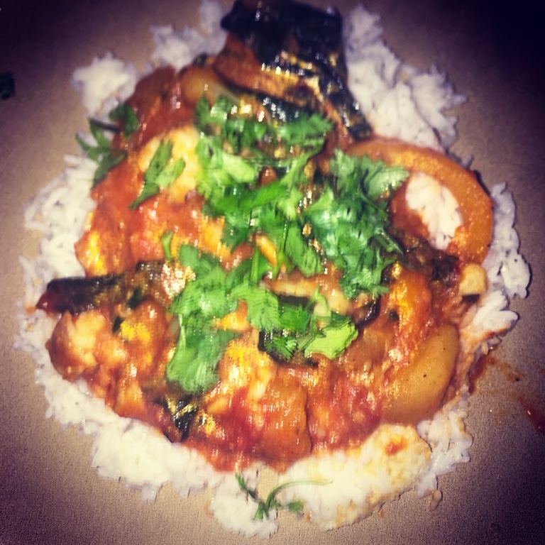 On medium heat, cook the Pollock. Make sure to be gentle with it as you flip it over to cook both sides as it will break up. It will cook extremely fast. Once the fish is done gently scoop out of the pan and add to your curry sauce. Stir. Serve with rice and garnish with fresh cilantro on top to bring a burst of flavor!