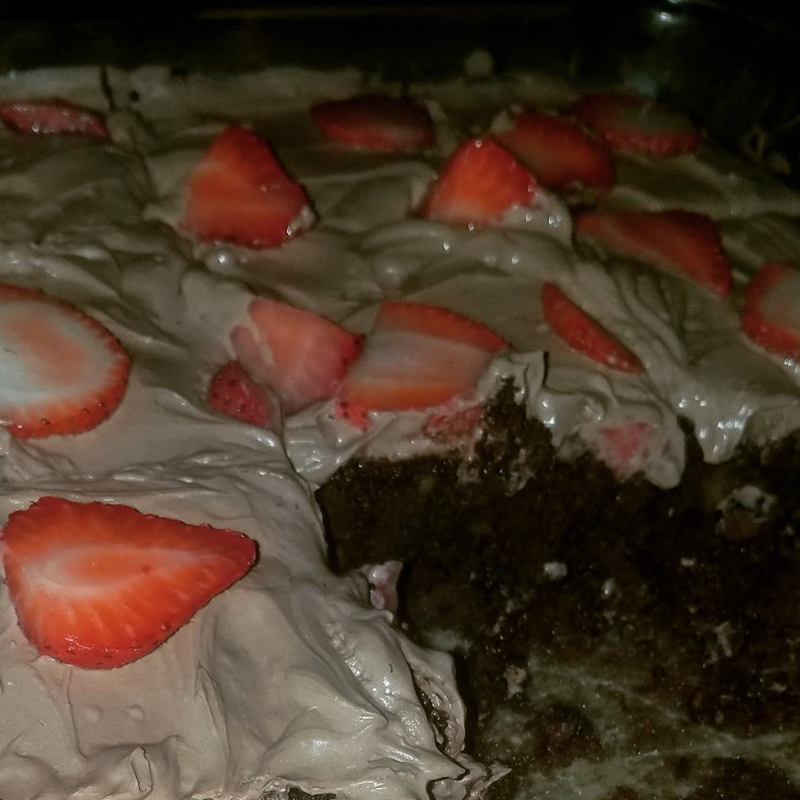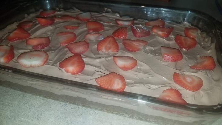 Spread over top brownie. Use all of it!! 🤣 Then take the sliced strawberries and spread all over.