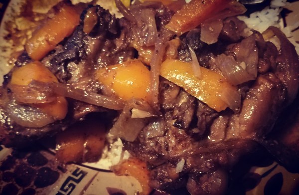 Let your beef slightly unthaw. It’s easier to slice it thin that way. In a large wok on medium, saute onions, garlic, ginger, and peppers in vegetable oil. Sprinkle salt and pepper. Next add beef and and pour in orange sauce. Continue to toss. Sprinkle more salt, pepper and red pepper powder. Pour in water. Allow it to simmer for a few minutes. Then toss some more. Once the beef and vegetables are almost done finally add the tomatoes. Toss for a couple of minutes and make sure not to overcook them. They should still retain their form. Serve with rice.