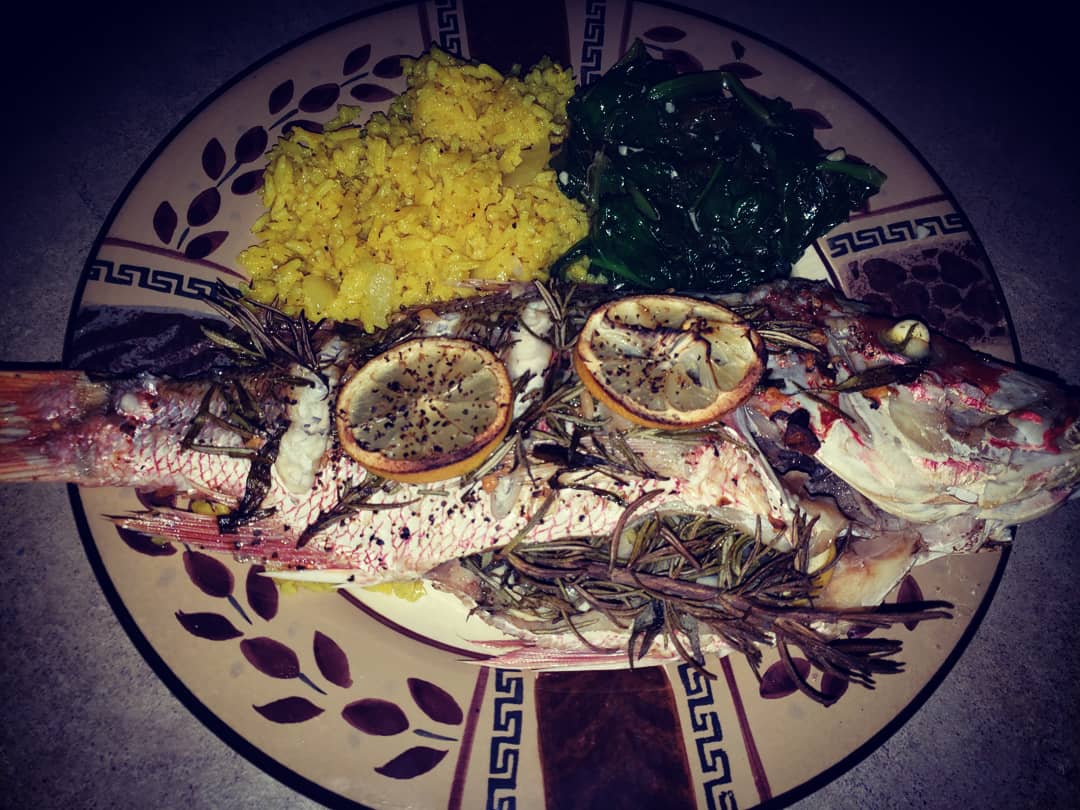 Preheat oven 425 degrees. Score fish on both sides. Pour some olive oil in a small bowl. Chop some of the rosemary, tarragon and garlic and mix it in. Yes, your hands are going to be fishy! Rub the fish with sea salt and then the olive oil seasoning mix. Stuff fish with remaining herbs, lemon and garlic. Drizzle more lemon juice on top of the fish. Garnish with lemon slices and sprinkle black pepper on top. Bake for 55 mins or until tender.