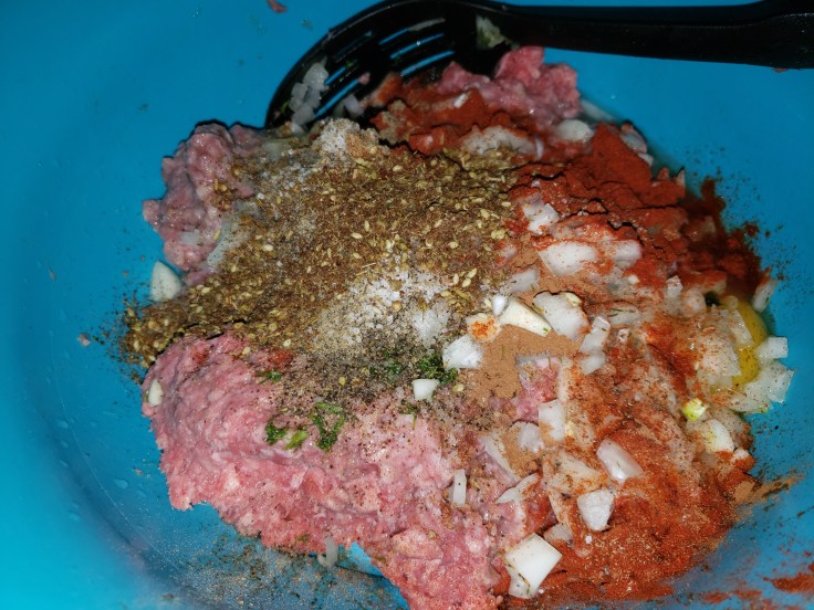Preheat oven 350 degrees. Hand mix the ground lamb and beef thoroughly. Then add the remaining ingredients.