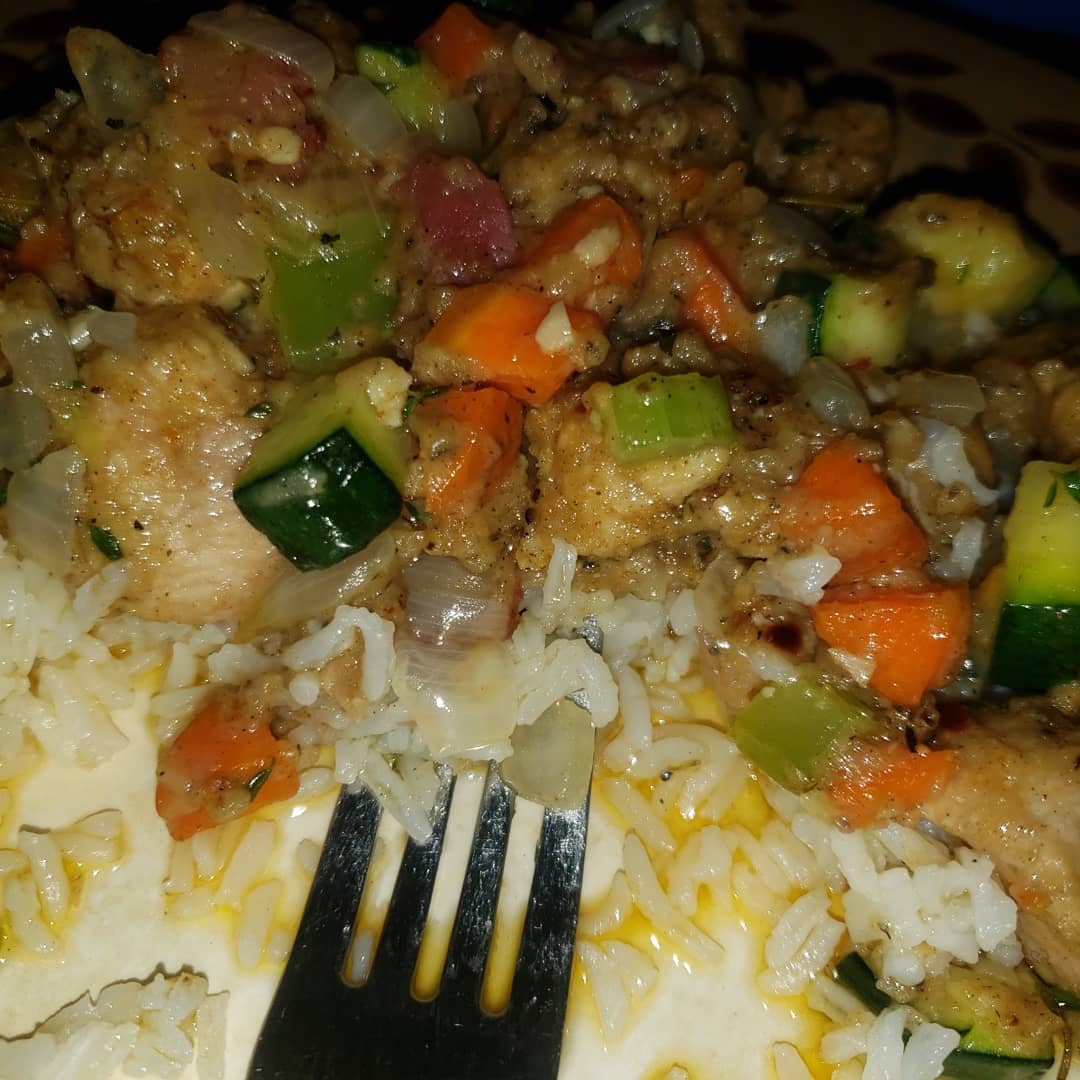 Fry the beef bacon in the other stick of butter. Then add vegetables. Sprinkle a little salt, pepper, and 4n1. Brown them then add back in the pheasant. I used fresh thyme about a tablespoon and continually tossed. Add two tablespoons of vegetable oil so it doesn’t stick to the pan.