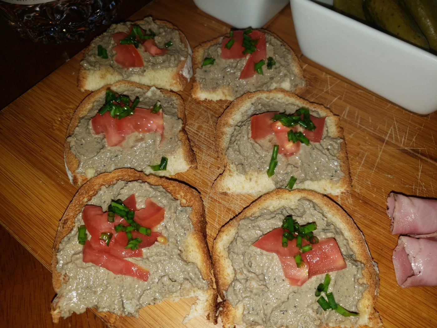I added a few goodies to snack on and garnished the pate with tomatoes and chives.