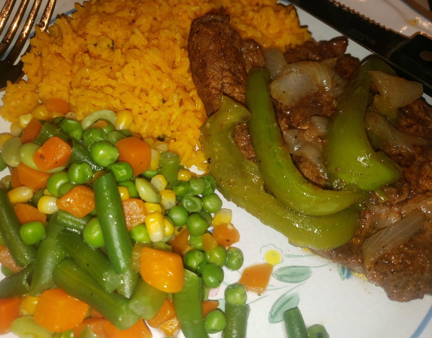 On medium heat, sear both sides of the steak in olive oil to lock in the juices. Add bell pepper and onion.