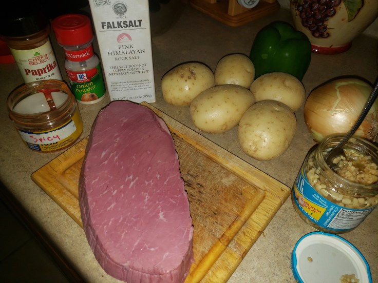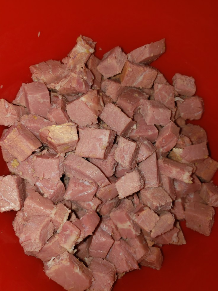 Your cornbeef should be cut up in small bites sizes like pictured. Then I mixed in the serrano peppers.