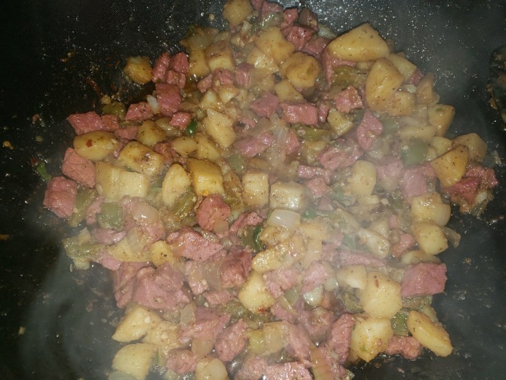I had to drain some excess vegetable oil off the potatoes. Next add the cornbeef and toss for about 5 minutes.