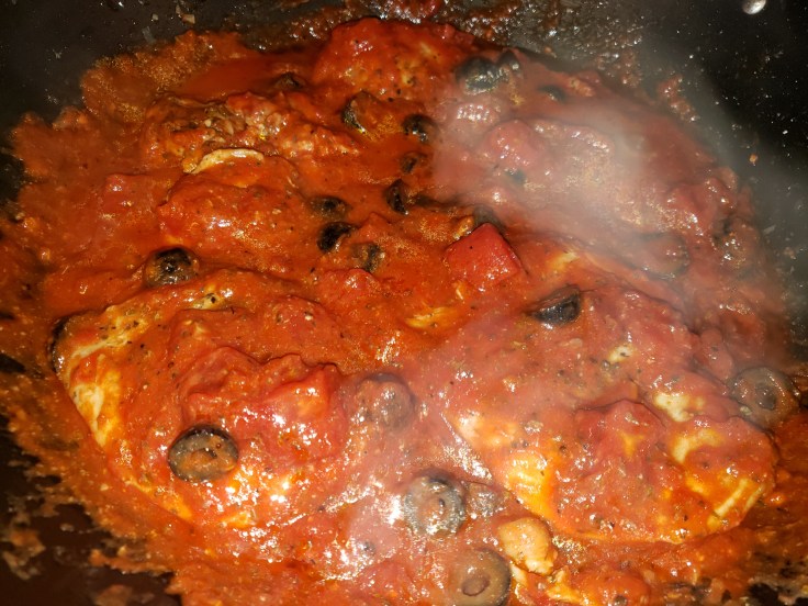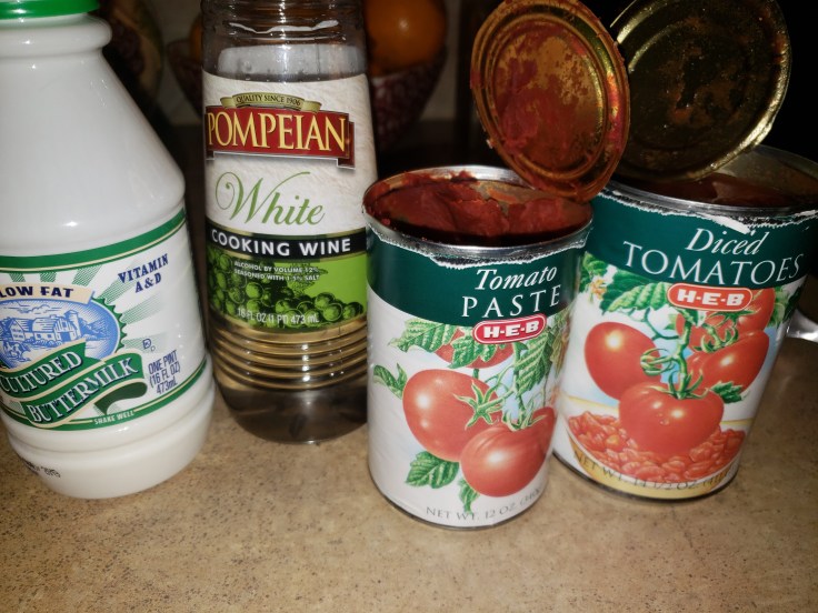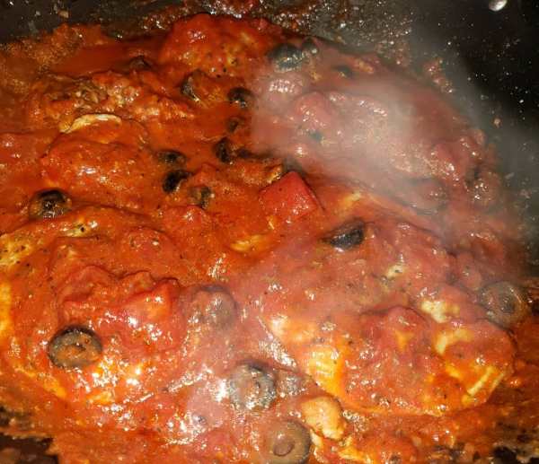 Finally add wine, paste, buttermilk, diced tomatoes and olives. Stir and toss until the sauce has mixed well. Allow to simmer on low. Sprinkle more salt, basil, oregano and black pepper to taste. Simmer for about 5 minutes or until chicken breast cooked through.