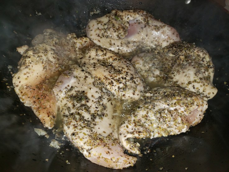 Add the chicken breast and start flipping until they are almost cooked through. Note if you have thinner cuts it will be a lot faster.