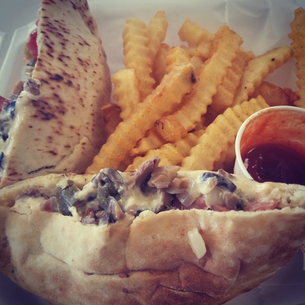 I had a lamb pita with pepper jack cheese, tomatoes, lettuce, olives, jalapeños, onions and spicy ranch sauce. Also you can choose between a regular ketchup or a spicy ketchup. I went with the spicy and large fries.