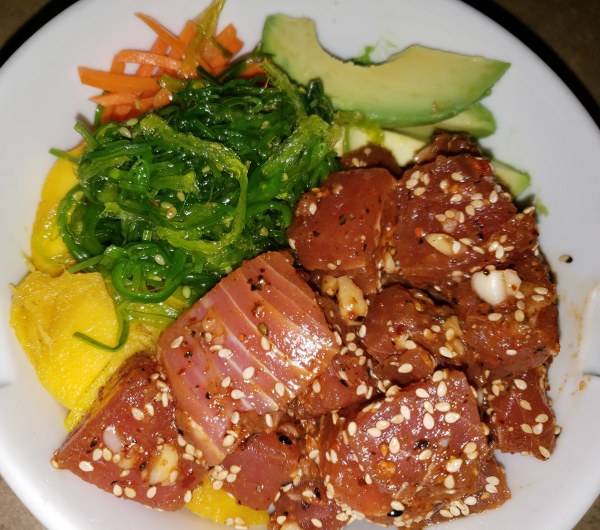 I really like this meal after a long day of work. It doesn’t take that long to pull off. The only thing that I didn’t have was the seaweed salad. But I was able to pick some up at my neighborhood grocery store because they have a sushi bar section. So I literally walked in the door put the rice on in my rice cooker. Diced the tuna steaks and marinated it in the marinade ingredients for 30 minutes. I tossed tuna in some sesame seeds as a garnish. Then I assembled the ingredients in a bowl… remember rice at the bottom.